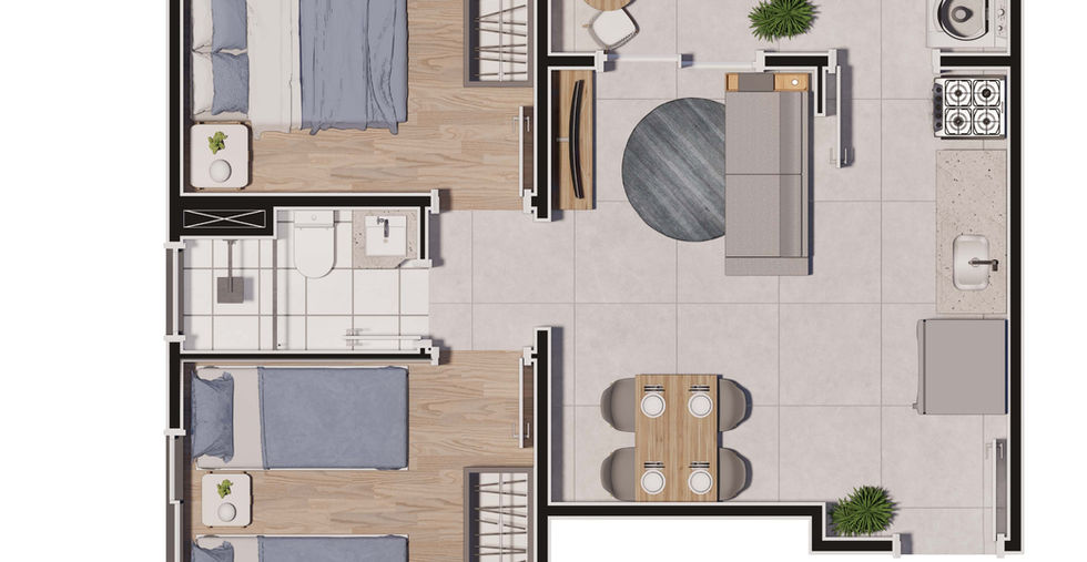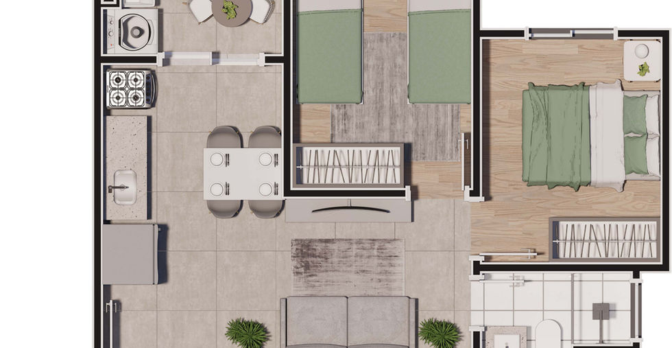 43,15m² de 2 quartos com ampla varanda integrada com a cozinha e a sala.
